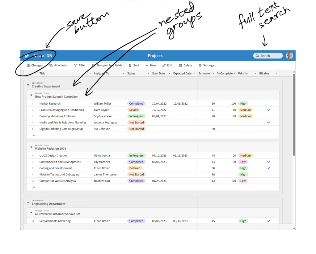 Visual DB Sheets supports nested groups. You can quickly find records using full-text search. The save button can preview your changes before committing changes to the database.